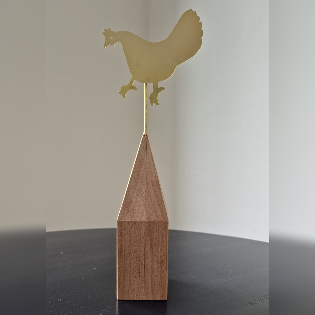 Des Weiteren gibt es ein Modell aus Messing, welches eine Einheit mit einem hölzernen Ständer bildet. So wird stilistisch die konkrete Situation an der Kirche angedeutet: die Henne auf der Kirchturmspitze, deren Aufgabe es ist, weitere Kirchen im Umland auszubrüten.